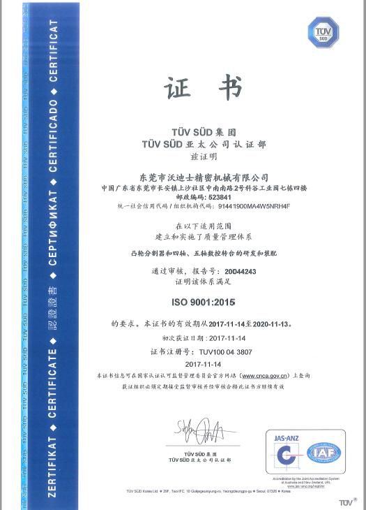 近日沃迪士在"凸輪分割器和四軸、五軸的研發(fā)和裝配”的質(zhì)量管理上的有效性通過了國(guó)際權(quán)威認(rèn)證機(jī)構(gòu)南德TUV SUD第二階段的嚴(yán)格審廠,獲得了ISO9001:2015 證書。