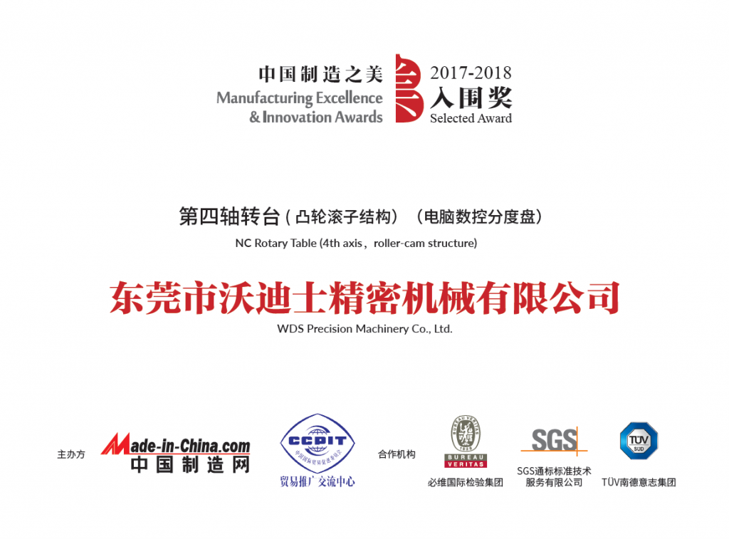 沃迪士參賽產(chǎn)品(第四軸轉(zhuǎn)臺 (凸輪滾子結(jié)構(gòu))(電腦數(shù)控分度盤))經(jīng)過初評、終評兩輪評選,從中國制造之美2017屆13個參賽組別4309件參賽產(chǎn)品中脫穎而出,榮獲2017“中國制造之美”年度評選 工業(yè)設(shè)備及組件 類 入圍獎!并將獲得由活動主辦方中國制造網(wǎng)、貿(mào)促會貿(mào)推中心,聯(lián)合國際三大知名認(rèn)證機(jī)構(gòu)SGS、BV、 TüV南德頒發(fā)的榮譽獎牌。
